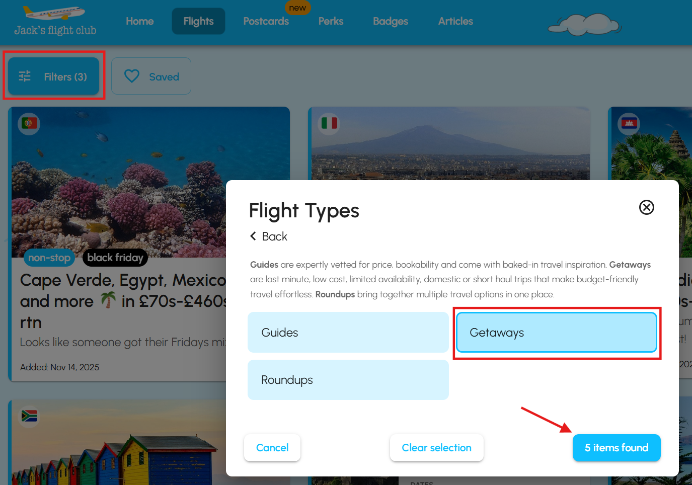 Now we have an amazing filter that will help you find the Getaways easier. Click on Filters and choose Flight Types. You’ll find the three (3) Flight categories, select Getaways and hit XX items found.
