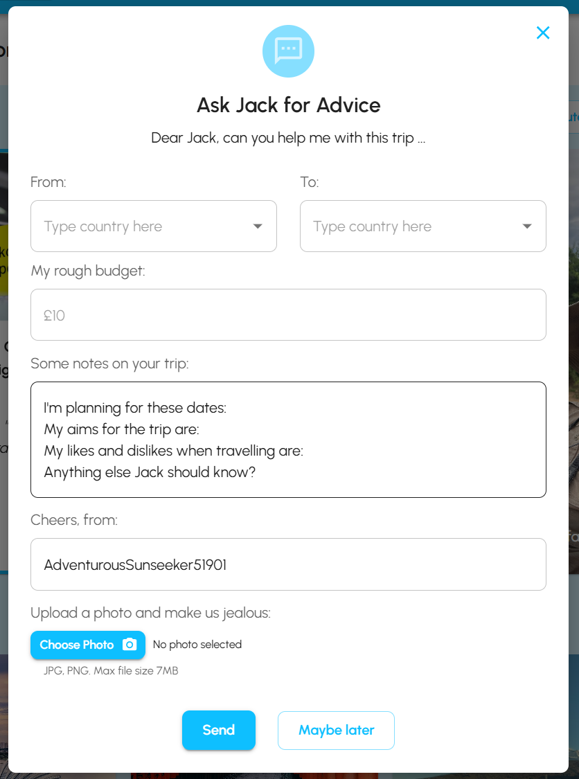 You've upgraded to First Class membership or purchased an Ask Jack: Escape Plan and want to request your first trip!