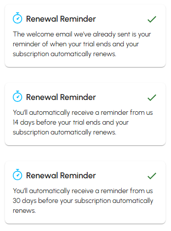 Your welcome email acts as your renewal reminder, letting you know when your trial ends and when your subscription will renew. No additional reminder emails are sent.