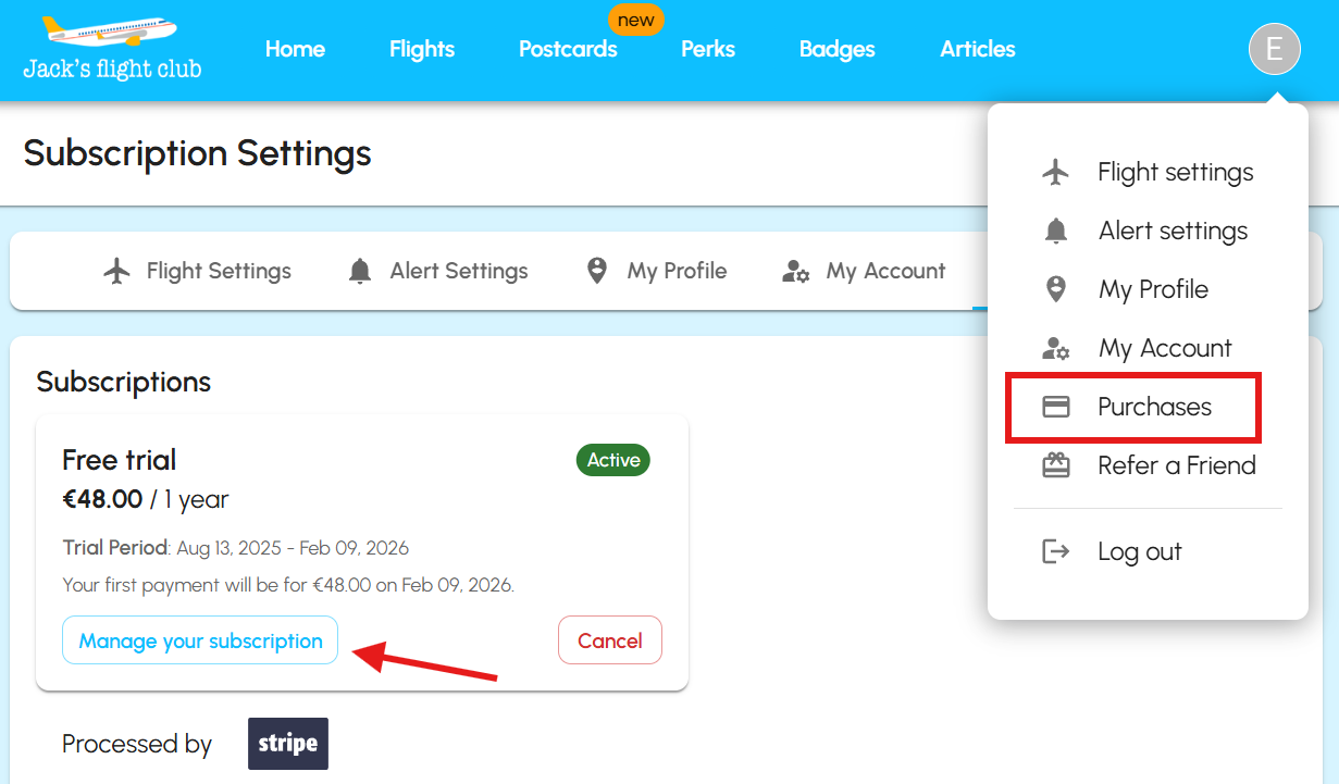 This is autofilled when you upgrade, often using details you’ve previously saved during online payments. Jack’s Flight Club doesn’t store this info — it’s managed securely through Stripe.