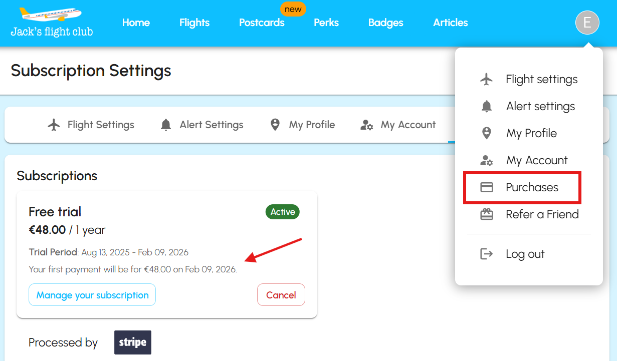 Please note that if you do not see Purchases in your menu, it may be because you paid via PayPal or iTunes. You can access your billing details on the iTunes or PayPal dashboard under your recurring subscription information. If you believe you paid by card but still can't find the tab, please email us at support@jacksflightclub.com, and we will look into this for you. :-)